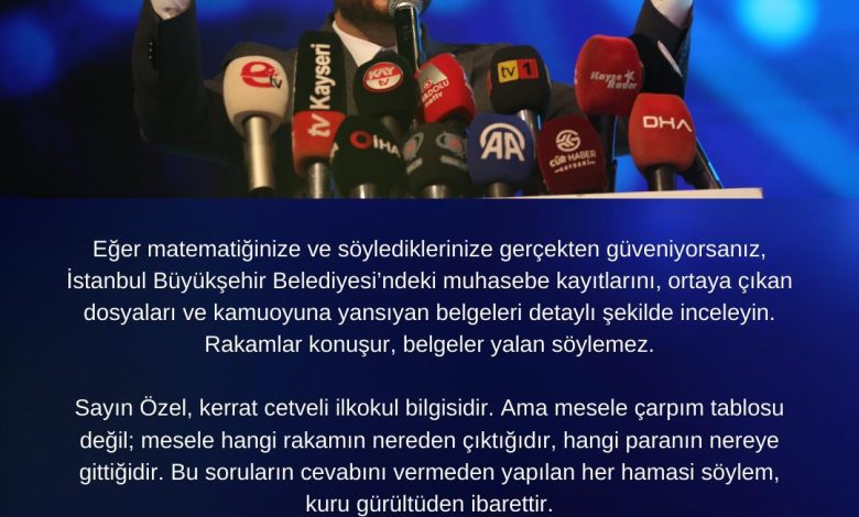 Açıklamada özellikle İstanbul Büyükşehir Belediyesi’ne dikkat çekilerek şu ifadelere yer verildi:“Eğer matematiğinize ve söylediklerinize güveniyorsanız, İstanbul Büyükşehir Belediyesi’ndeki muhasebe kayıtlarını, ortaya çıkan dosyaları ve kamuoyuna yansıyan belgeleri detaylı şekilde inceleyin. O zaman neyin ne olduğu çok daha net anlaşılacaktır.”