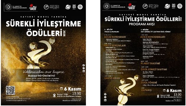 6 Kasım 2025 Perşembe günü, Kayseri OSB Ahi Evran Konferans Salonu’nda saat 13:30’da başlayacak etkinlik, üretimde verimlilik alanında fark yaratan projeleri ödüllendirerek bölge sanayisine ilham vermeyi hedefliyor.