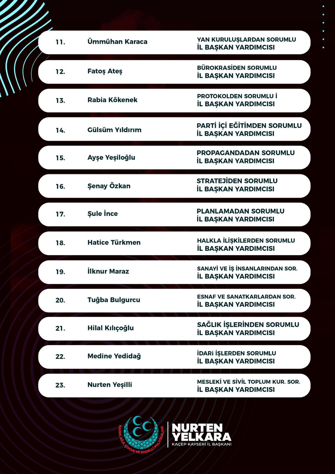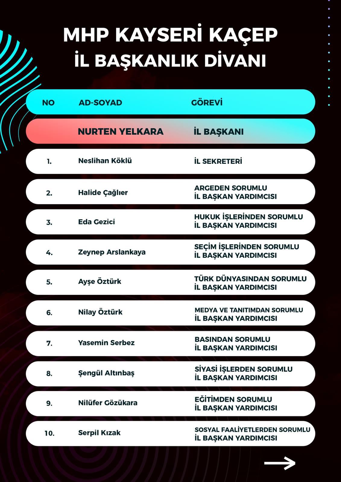 “Milliyetçi Hareket Partisi Kayseri KAÇEP İl Başkanlığı olarak, liderimiz Sayın Devlet Bahçeli’nin gösterdiği hedefler ve ülkücü hareketin kutlu davasına olan inancımızla yeni dönem İl Divan Kurulumuzu oluşturmuş bulunuyoruz. Dava şuuru yüksek, azimli ve inançlı teşkilat mensuplarımızdan oluşan Divan Kurulumuz; Türk kadınının üretkenliğini, fedakârlığını ve kararlılığını temsil etmektedir. Liderimizden aldığımız ilhamla, Kayseri’mizde KAÇEP teşkilatımızı daha da güçlendirmek, kadınlarımızı milli şuurla toplumsal hayatta daha etkin kılmak için azimle çalışacağız. Birlikte güçlü, birlikte ülkücü, birlikte Milliyetçi Hareket Partisi! Ne mutlu Türküm diyene”